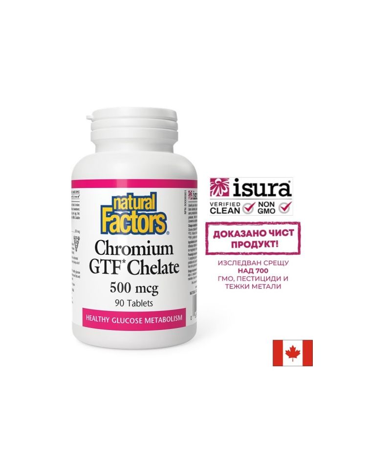 Хром GTF* (хелат) на канадската компания Natural Factors е натурален продукт спомагащ за поддържане на нормален глюкозен метаболизъм.