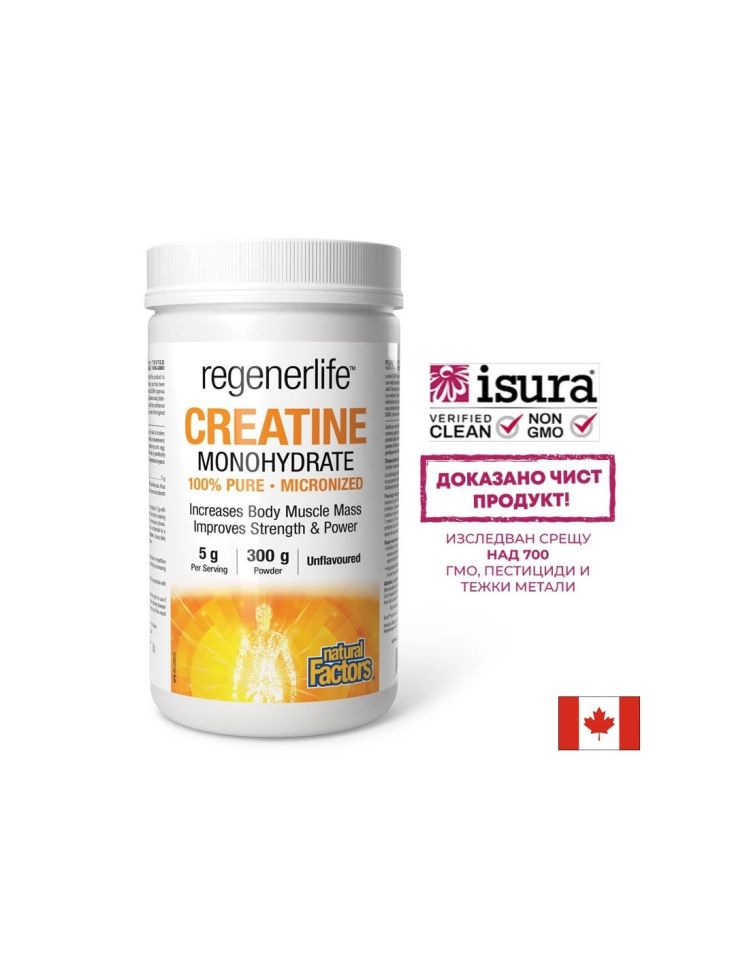 Creatine monohydrate от серията RеgenerLife на канадската компания Natural Factors e натурален продукт допринасящ за оптималното състояние на мускулите и енергийния метаболизъм.