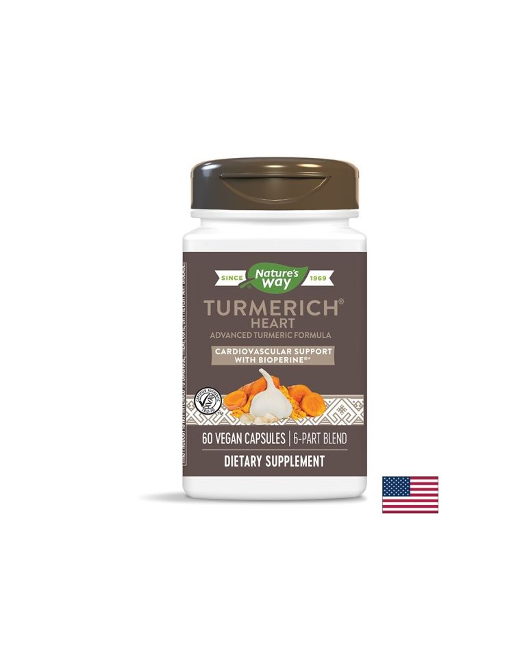 Надеждна грижа за сърцето и сърдечно-съдовата система с изцяло растителната формула Turmerich™ Heart! Turmerich™ Heart комбинира стандартизиран екстракт от куркума с екстра качество (източник на 95% куркуминоиди), екстракти от чесън (луковица), нар (цял плод) и глог (лист и цвят), коензим Q10, както и стандартизиран екстракт от черен пипер BioPerine®, който максимално увеличава усвоимостта на куркумата!