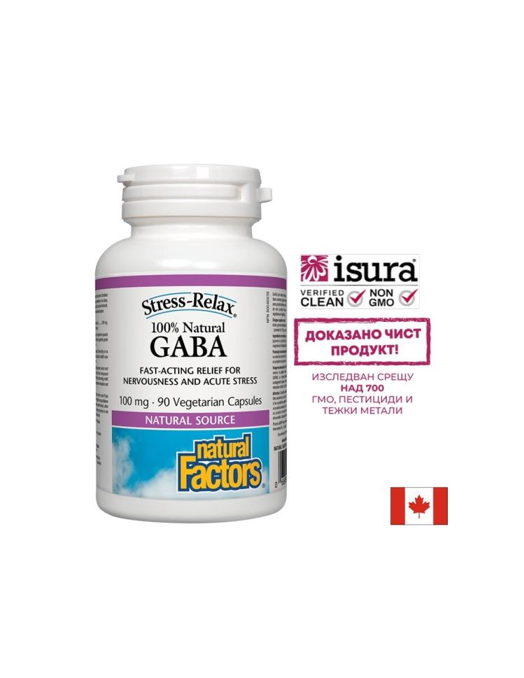 Добавката ГАБА на Natural Factors е приготвена с PharmaGABA™ - 100% натурална форма, която за разлика от синтетичните форми, преминава през кръвно-мозъчната бариера. ГАБА е мощно средство за облекчаване при остър стрес, фобии и страхове. Ежедневният стрес е част от модерния начин на живот и при някои хора може да доведе до безсъние и нервна възбудимост. При други може да се натрупа в дългосрочен план, което може да бъде голямо предизвикателство за нервната система и да доведе до депресия, пристъпи на гняв, пълно прегаряне и други защитни реакции. Гама-аминобутировата киселина е естествено вещество, което се отделя в мозъка и има успокояващо въздействие. В действителност това е един от най-мощните регулатори на нормалните мозъчни функции и невротрансмисии. Много от хората, които страдат от нервна възбудимост, безсъние, епилепсия и други мозъчни проблеми не произвеждат достатъчно ГАБА. Ето защо в тези случаи е необходим приемът на добавки с ГАБА.