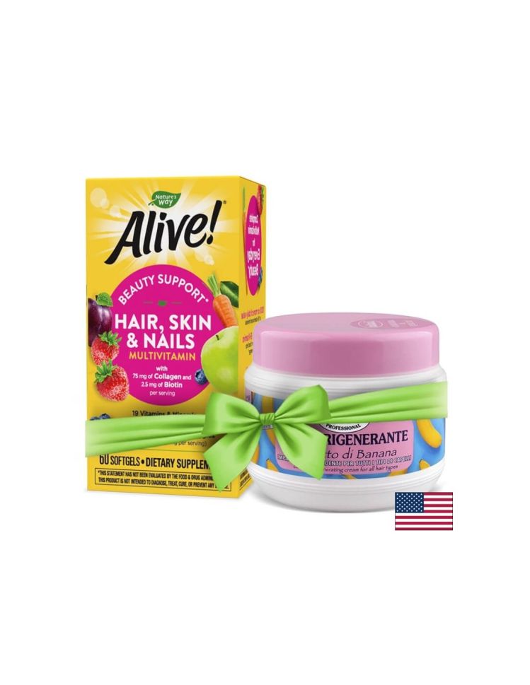 Комплексна грижа за здрави и красиви коса, кожа, нокти Специално предложение! При покупка на Мултивитамини за коса, кожа и нокти Alive! получавате ПОДАРЪК регенерираща маска за коса Banana Fruit Regenerating Cream 500mL на италианския бранд Mil Mil, подходяща за всички видове коса!