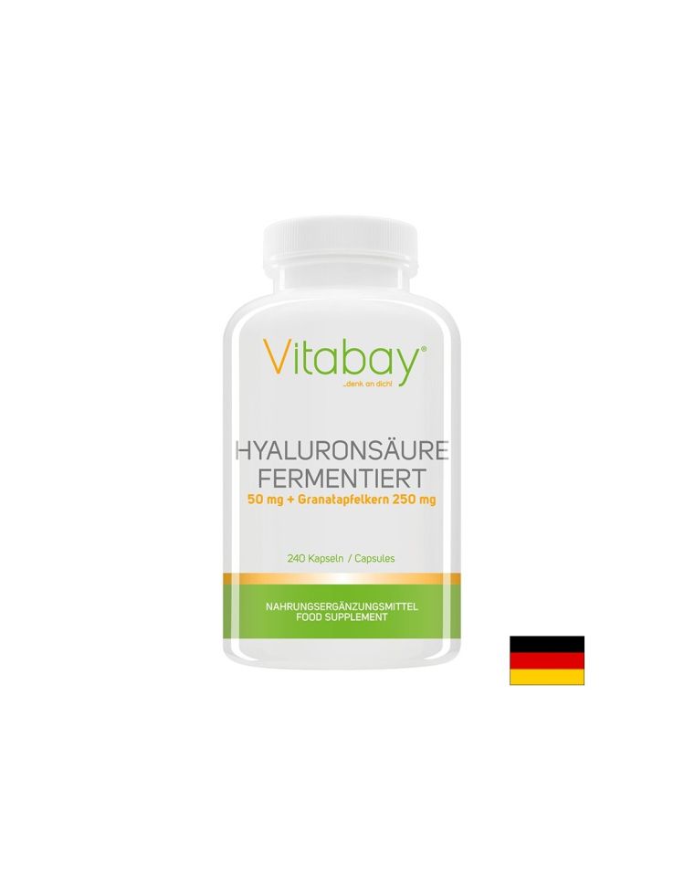 Hyaluronsäure fermentiert / Хиалуронова киселина + Нар, 240 капсули е висококачествена хранителна добавка, създадена да подпомага здравето на кожата, тъканите и хрущялите. Съдържа комбинация от ферментирала хиалуронова киселина и екстракт от семена на нар, които работят синергично за поддържане на младостта, еластичността и регенерацията на тъканите.