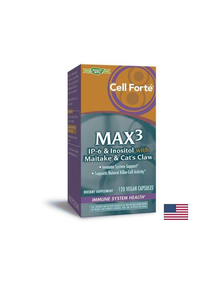 Cell Forte MAX3 активира естествената защита на тялото. IP-6 (фитинова киселина) действа като мощен антиоксидант, който се бори със свободните радикали. Свободните радикали причиняват увреждане на клетките. IP-6 помага да се увеличи активността на клетките, които се борят с инфекцията, и спомага за поддържането на нормален растеж на клетките. Употребата на инозитол може да предотврати образуването на вредни клетки в тялото. Инозитолът оказва ползи за понижаване нивата на холестерола.