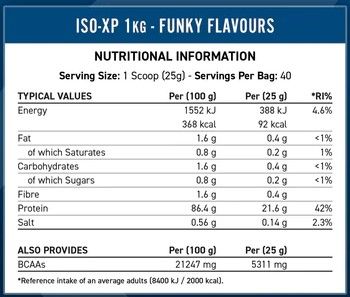 ISO-XP е високопротеинова добавка, използваща най-чистия и най-висококачествен суроватъчен протеинов изолат наличен днес с ниско съдържание на мазнини, въглехидрати и захар, като същевременно осигурява високи нива на протеин на 25g порция. ISO-XP няма добавена соя и вместо това използва слънчогледов лецитин като емулгатор.