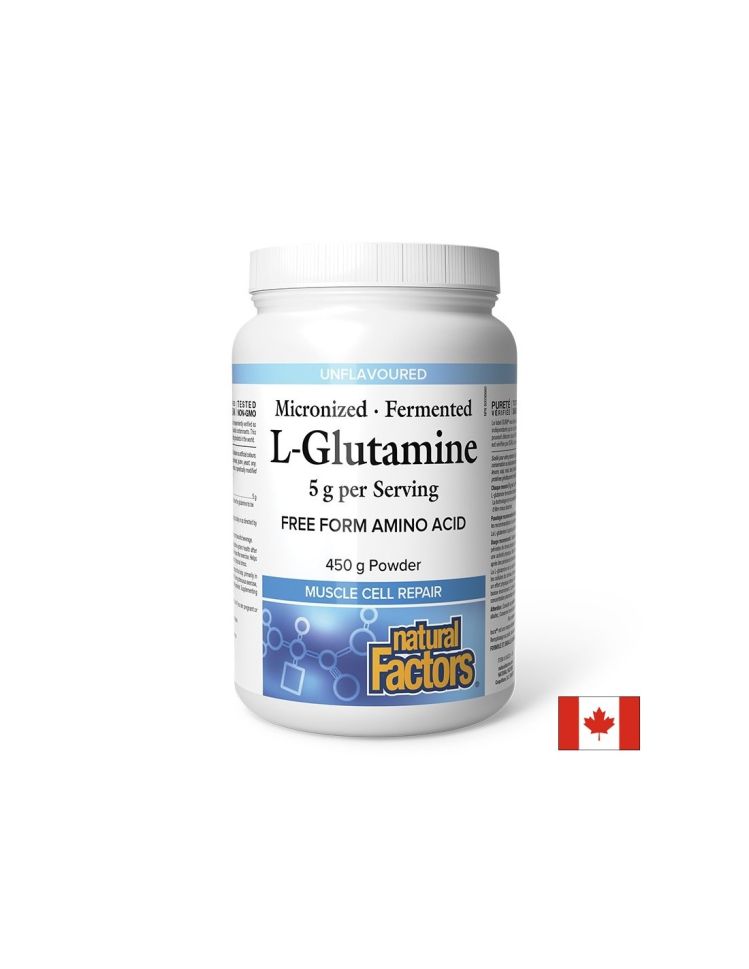 Л-Глутаминът в продукта на Natural Factors е микронизиран. Микронизираният Л-Глутамин е фармацевтичен клас, аминокиселина в свободна форма, произведена чрез естествен процес на ферментация. Използвана е технология за микронизиране за да се сведе до минимум размерът на частиците, което прави глутамина по-лесен за разграждане и усвояване от организма. Л-Глутамин на Natural Factors подходящ за вегани и осигурява 5 g микронизиран Л-Глутамин дневно лесно разтворим във вода или сок.