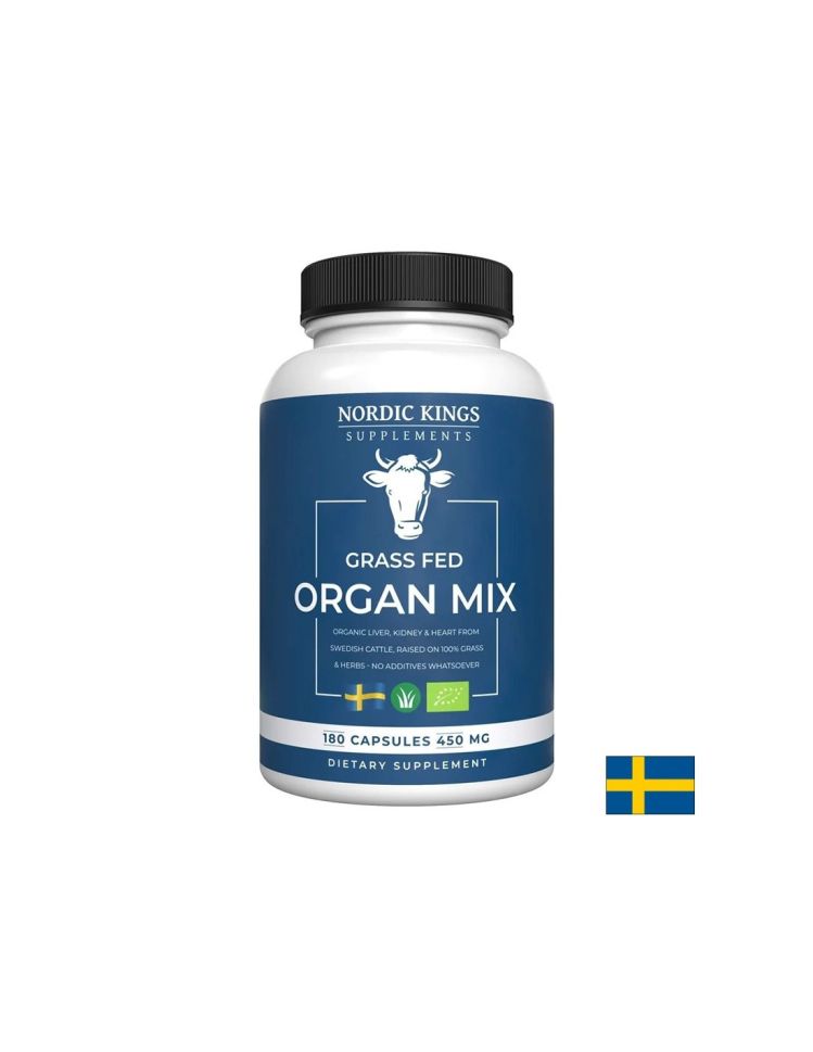 Organ Mix (grass fed) - Телешки черен дроб, бъбрек и сърце е напълно органична хранителна добавка под формата на капсули, добита от черен дроб, бъбрек и сърца от хранени изцяло с трева и билки KRAV сертифицирани телета. Не съдържа в състава си пестициди, антибиотици или хормони.