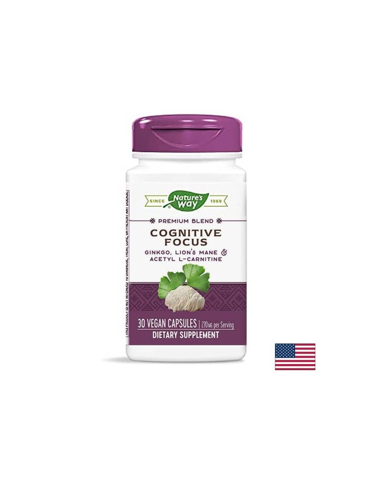 Cognitive Focus на Nature’s Way съдържа екстракт от лист на гинко билоба, екстракт от гъбата ямабушитаке /Hericium erinaceus/ и Ацетил L-Карнитин за подобряване на паметта и когнитивните функции.