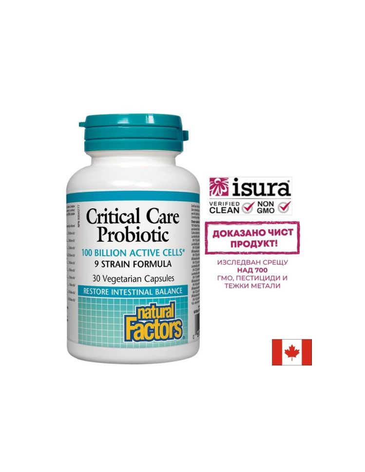 Пробиотикът Critical Care Probiotic на Natural Factors включва 9 щама бифидобактерии и 4 щама лактобацили, които осигуряват мощна защита на стомашно-чревната и имунната система.Тази формула бързо възстановява разнообразната микрофлора след употребата на антибиотик. Всеки щам бактерии в тази формула е устойчив на стомашната киселина, което позволява на пробиотиците да достигнат до червата в пълния си потенциал. Във всяка капсула има гарантирано количество от 55 милиарда активни клетки.