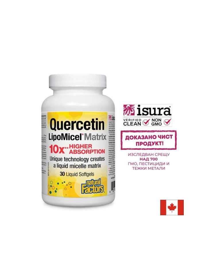Стандартните форми на кверцетин могат да бъдат трудни за усвояване от организма, което от своя страна намалява ефективността му. Кверцетин 250 mg LipoMicel Matrix 10 X Higher Absorption на Natural Factors е произведен чрез уникалната патентована технология LipoMicel, която спомага да се преодолее тази ниска бионаличност чрез създаване на течна мицелна матрица, която разпръсква кверцетина на малки микрокапчици. По този начин е с 10 пъти по-висока абсорбция от стандартните форми.