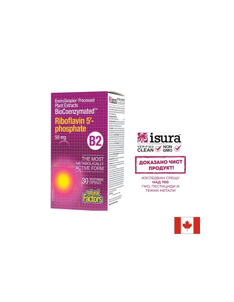 Продуктът на Natural Factors запазва висока бионаличност дори при увредено тънко черво и малабсорбция поради генетични, токсични или лекарствено-индуцирани причини. Витамин В2 (Рибофлавин-5-фосфат) е допълнен с патентованата, биоактивна смес Farm Fresh Factors, включваща зеленчуци, плодове, билки, растения и морски видове: