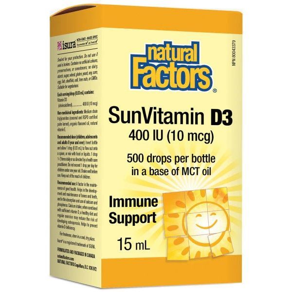 Витамин D3 400 IU (капки за деца) e продукт на Natural Factors – най-големият производител на природни продукти в Канада. Компанията предлага над 500 хранителни и диетични добавки, под формата на гел-капсули, проахове, тинктури и др. Компанията работи съвместно с екип от традционни лекари, натуропати, фитотерапевти, диетолози и др., с цел максимално високо качество на всички продукти!