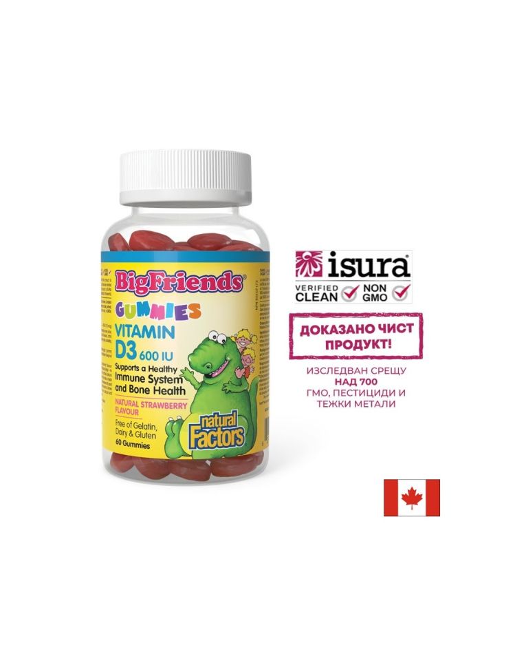 Витамин D3 гъми за деца 600 IU от серията Big Friends на канадската компания Natural Factor e висококачествен източник на витамин D, под формата на лесни за прием желирани таблетки с вкус на ягода.