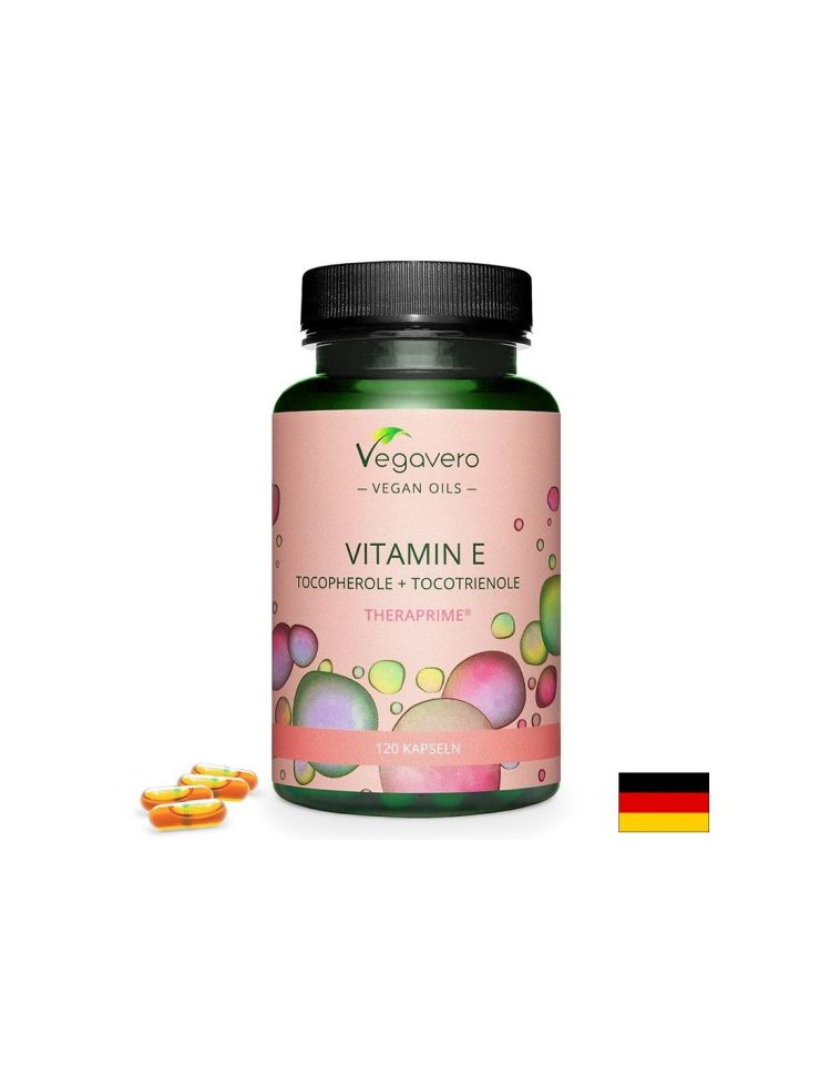 Vitamin E (Tocopherole + Tocotrienole) на Vegavero съдържа витамин Е извлечен чрез студено пресоване от оризови трици и е изключително богат на токофероли и токотриеноли. Чрез този метод на извличане токоферолите и токотриенолите не се увреждат. TheraPrime™ e патентован и многократно тестван маслен концентрат от оризови трици. Продуктът се усвоява 3 пъти по-добре от синтетичната му форма и притежава много висока бионаличност.