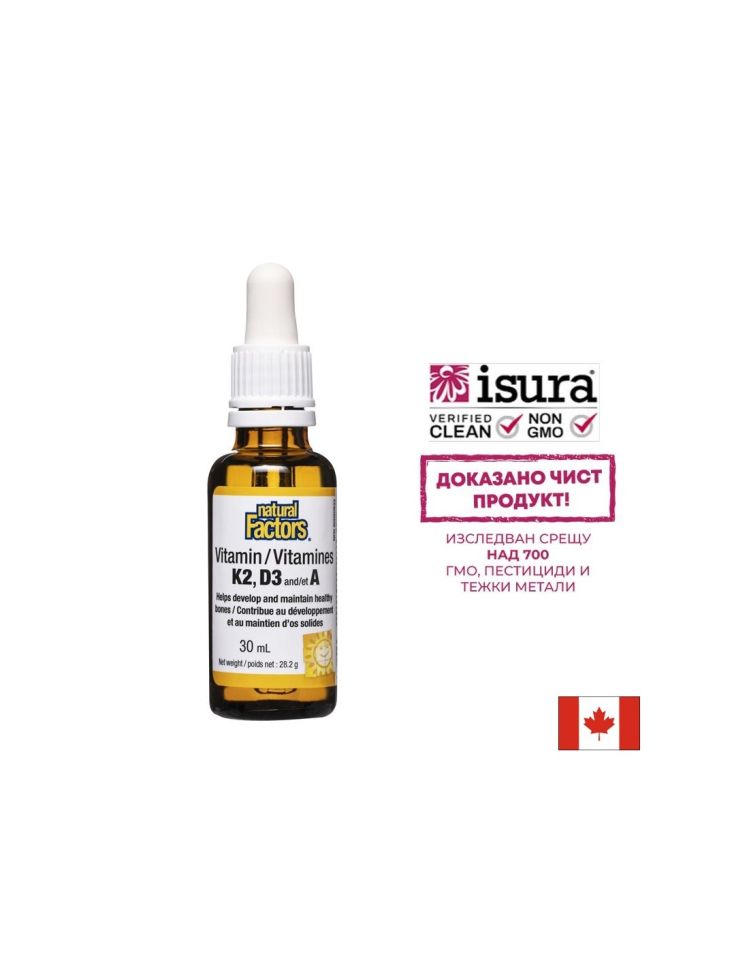 Витамин K2, D3, А на канадската компания Natural Factors е мощна комбинация от витамини, подпомагаща здравето на очите, костите, зъбите, имунната система и нощното виждане. За профилактика и съпътстваща терапия при остеопороза.